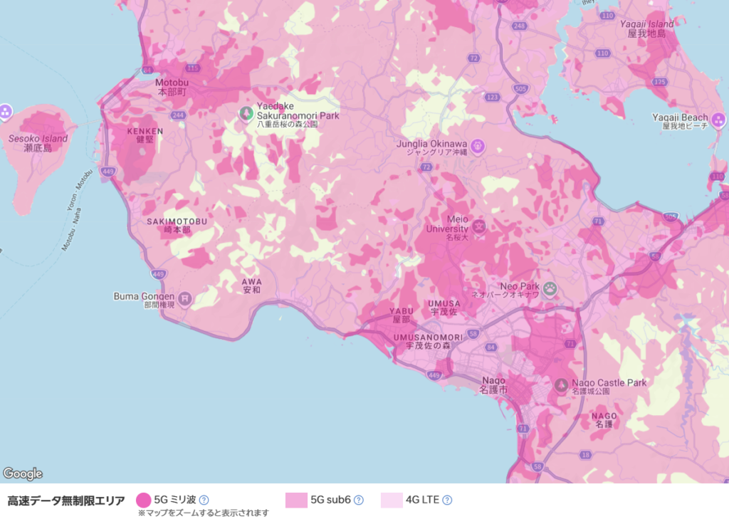 宇利島がある今帰仁村での測定データは少なく、2Mbps程度とかなり遅い結果も報告されています。橋を渡るときや島の端では楽天回線が入りにくく、auローミングに切り替わることが多いので、ゆっくりとした通信環境を想定しておきましょう。